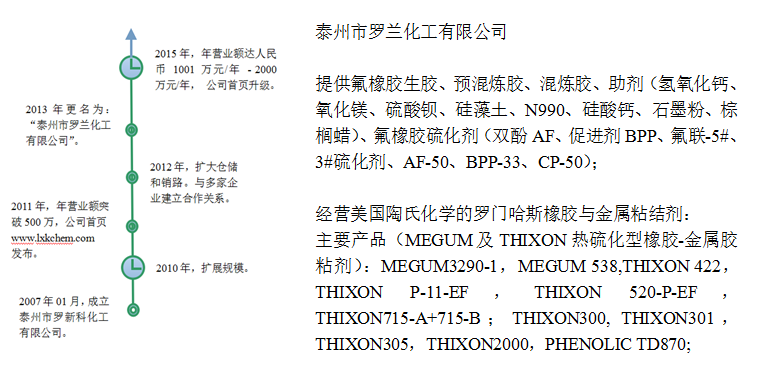 泰州市羅蘭化工有限公司向您提供氟橡膠生膠、預(yù)混煉膠、混煉膠、助劑(氫氧化鈣、氧化鎂、硫酸鋇、硅藻土、N990、硅酸鈣、石墨粉、棕櫚蠟)、氟橡膠硫化劑(雙酚AF、促進劑BPP、氟聯(lián)-5#、3#硫化劑、AF-50、BPP-33、CP-50);經(jīng)營美國陶氏化學(xué)的羅門哈斯橡膠與金屬粘結(jié)劑,主要產(chǎn)品(MEGUM及THIXON熱硫化型橡膠-金屬膠粘劑):MEGUM3290-1,MEGUM 538,THIXON 422,THIXON P-11-EF,THIXON 520-P-EF,THIXON715-A+715-B;THIXON300,THIXON301,THIXON305,THIXON2000,PHENOLIC TD870;